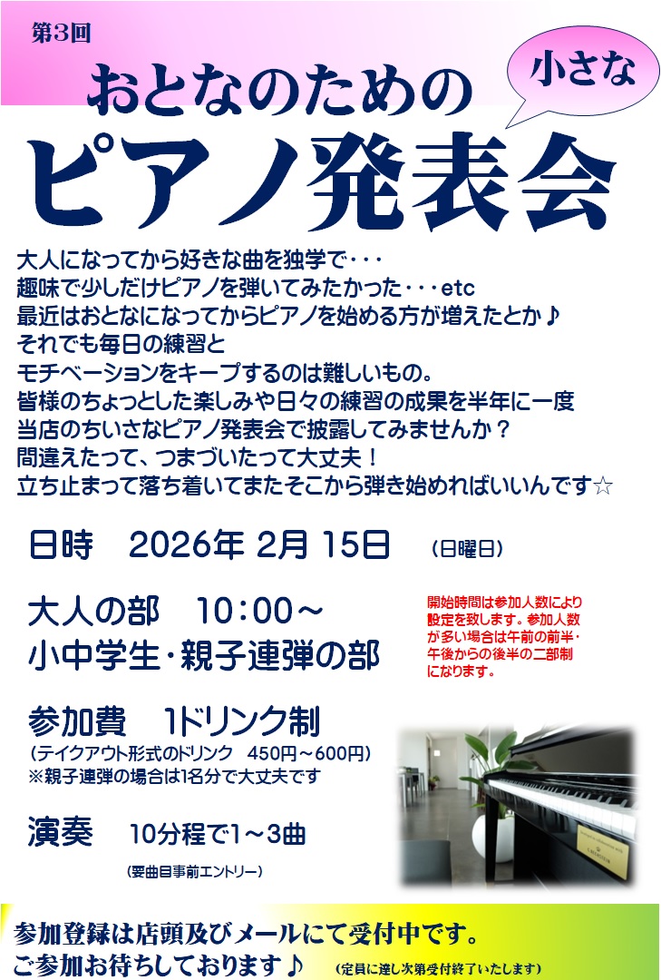 もっと身近にピアノ演奏会を♪当店のピアノについて